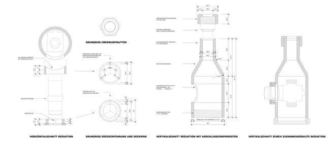 Da die neuen Duschen nicht mehr mit den früher üblichen Handräder auszustatten waren, sondern mit selbstschliessenden Drückerventilen, mussten komplexe Spezialkomponenten hergestellt werden, welche im Innern der rekonstruierten Reduktionen millimetergenau zusammen-