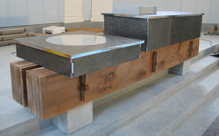 Alle Komponenten sind aus massiven Aluminiumplatten gefertigt, deren Oberflächen grösstenteils mit einer eigens dafür entwickelten Prägestruktur versehen. Beide Literaturaufsätze sowie die kreisrund gefräste, nach aussen auf Null laufende Aussparung zur Aufnahme des Wassers im Taufbecken wurden hochglanzpoliert. In derselben Materialisierung ausgeführt wurden auch Kerzenständer, Kollektenkassen sowie die Beschläge des gläsernen Eingangsbereiches.